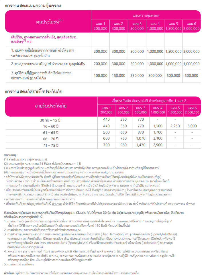 | หมายเหตุ : | * สำหรับแผนความคุ้มครองแผน 6 ** อาณาเขตคุ้มครอง: ตลอด 24 ชั่วโมง ทั่วโลกเป็นระยะเวลา 1 ปี *** การแถลงสุขภาพเป็นปัจจัยหนึ่งในการพิจารณารับประกันภัย/พิจารณาจ่ายเงินตามสัญญาประกันภัย |
