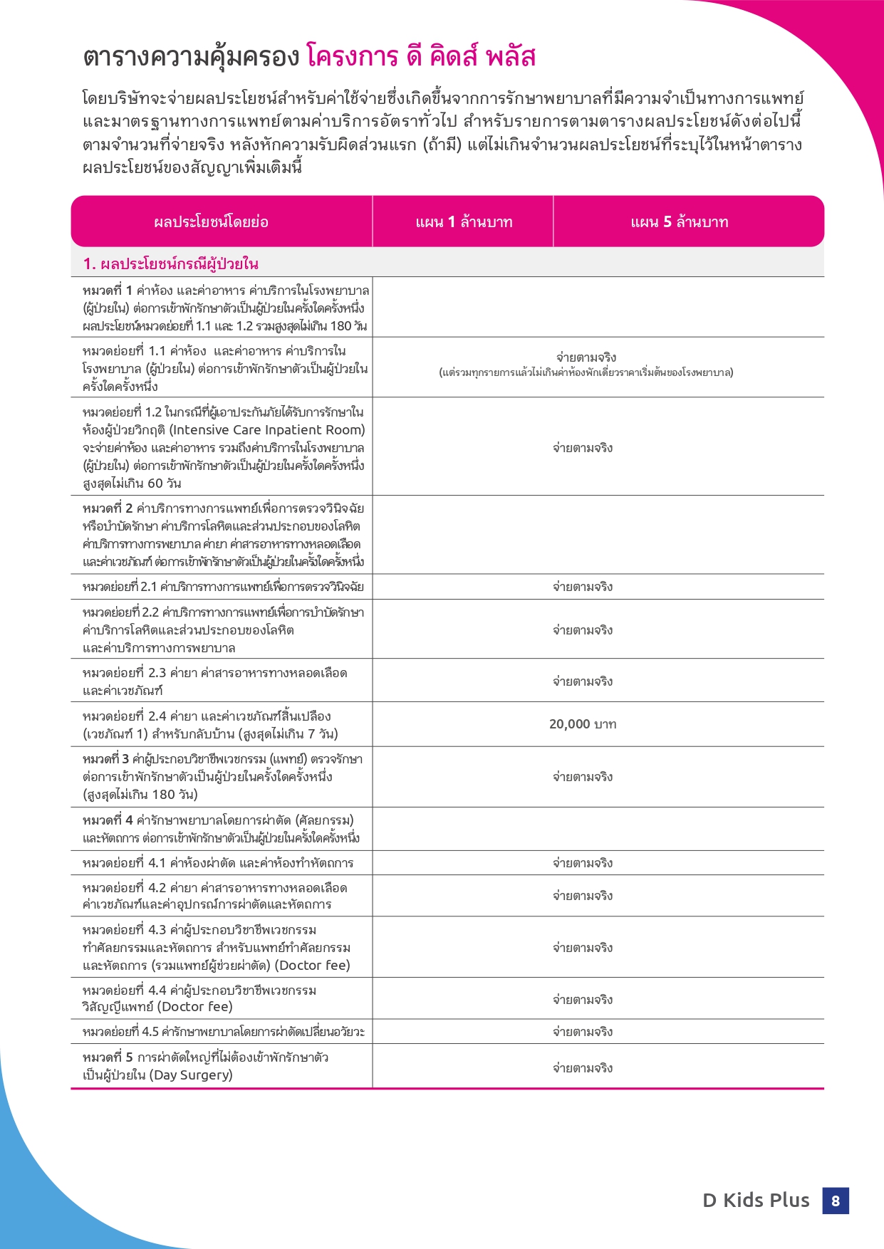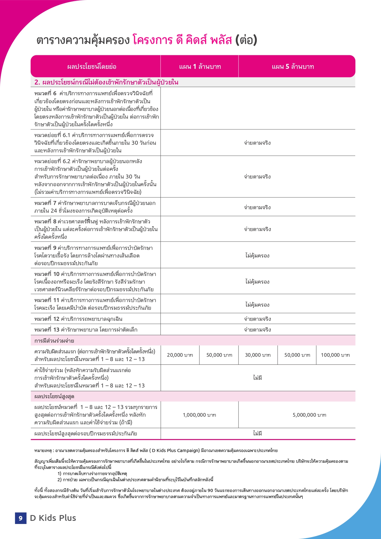- ดี คิดส์ พลัส ช่วยจ่ายส่วนเกิน ค่าห้องเดี่ยวมาตรฐาน ค่าห้องผู้ป่วยหนัก (ไอ.ซี.ยู.) ทั้งค่าหมอ ค่ายา ค่าตรวจ ค่าผ่าตัด ค่ากายภาพบำบัด กรณีแอดมิทรวมถึงการรักษาฟื้นฟูต่อเนื่องกรณีผู้ป่วยนอก เหมาจ่ายในวงเงินเดียวสูงถึง 5 ล้านบาท* ต่อการเข้าพักรักษาตัวครั้งใดครั้งหนึ่ง