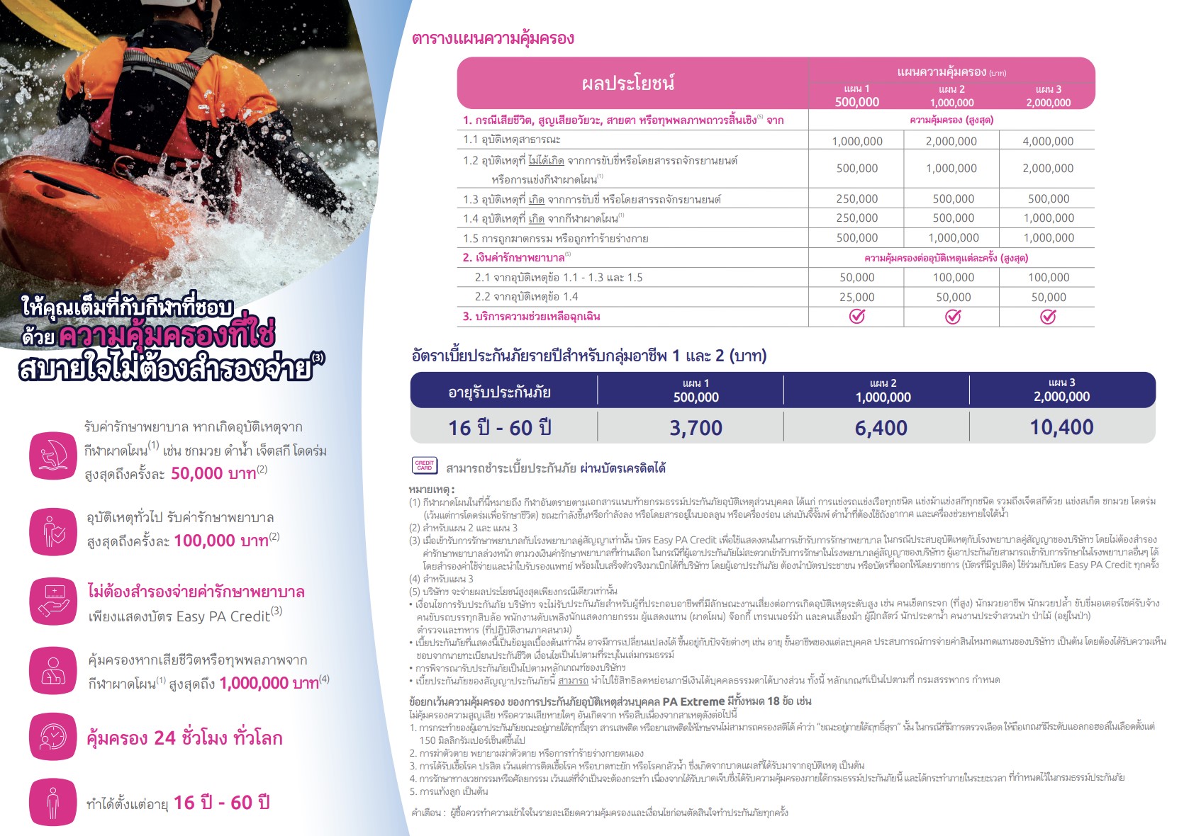 1. อายุเริ่มของผู้เอาประกันภัย : 16 - 60 ปี และให้ความคุ้มครองถึงอายุ 61 ปี2. ผู้เอาประกันภัย สามารถซื้อแบบประกันภัยอุบัติเหตุส่วนบุคคล แบบ PA Extreme ได้มากกว่า 1 กรมธรรม์ต่อผู้เอาประกันภัยแต่ละคน 3. การชำระเบี้ยประกันภัย : รายปี4. การตรวจสุขภาพ : ไม่ต้องตรวจสุขภาพ5. รับประกันภัยเฉพาะกลุ่มอาชีพ 1, 26. สามารถชำระเบี้ยประกันภัย ผ่านบัตรเครดิตได้7. บริษัทจะไม่พิจารณารับประกัน สำหรับผู้ที่ประกอบอาชีพที่มีลักษณะงานเสี่ยงต่อการเกิดอุบัติเหตุในระดับสูง ได้แก่ ผู้ปฏิบัติงานด้านช่าง หรือกระบวนการผลิต หรือการบริการซึ่งส่วนใหญ่มีการใช้เครื่องจักรกลหนัก ผู้ใช้แรงงาน ตลอดจนผู้ปฏิบัติงานเกี่ยวกับการขนส่งที่มีการเดินทาง เช่น- คนเช็ดกระจก (ที่สูง)