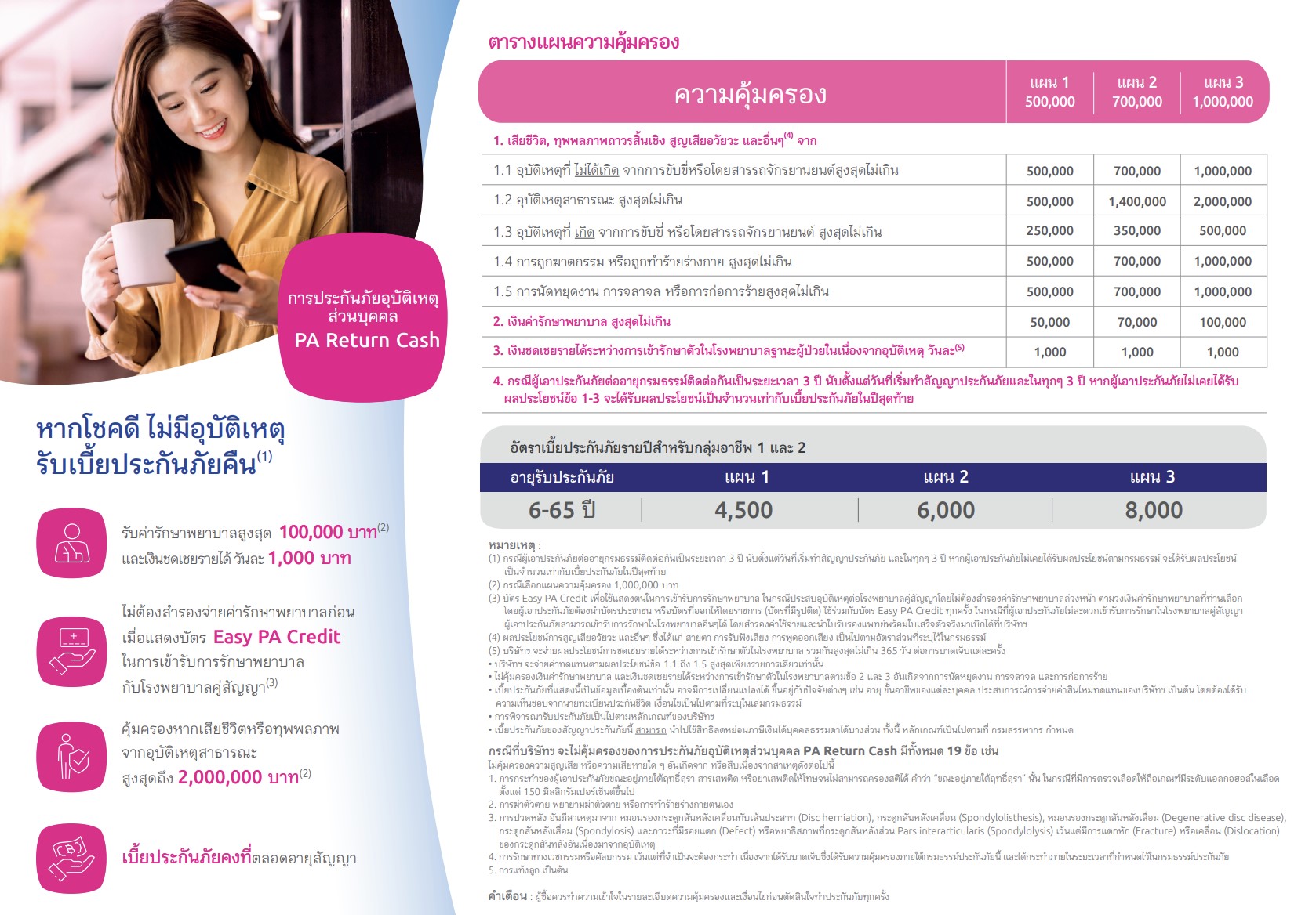 ** บัตร Easy PA Credit เพื่อใช้ในการเข้ารับการรักษาพยาบาล ในกรณีประสบอุบัติเหตุต่อโรงพยาบาลคู่สัญญาโดยไม่ต้องสำรองจ่ายค่ารักษาพยาบาลล่วงหน้า ตามวงเงินรักษาพยาบาลที่ท่านเลือก โดยผู้เอาประกันภัยต้องนำบัตรประชาชน หรือบัตรที่ออกให้โดยราชการ (บัตรที่มีรูปติด) ใช้ร่วมกับบัตร Easy PA Credit ทุกครั้ง ในกรณีที่ผู้เอาประกันภัยไม่สะดวกเข้ารับการรักษาในโรงพยาบาลคู่สัญญา ผู้เอาประกันภัยสามารถเข้ารับการรักษาในโรงพยาบาลอื่นๆ ได้ โดยไม่ต้องสำรองจ่ายและนำใบรับรองแพทย์พร้อมใบเสร็จตัวจริงมาเบิกได้ที่บริษัทฯ