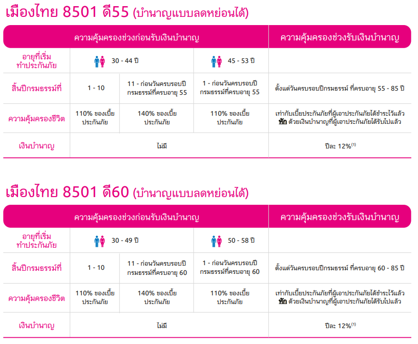 | 1. อายุที่รับประกันภัย | : เมืองไทย 8501 ดี55(บำนาญแบบลดหย่อนได้) : 30 – 53 ปี : เมืองไทย 8501 ดี60(บำนาญแบบลดหย่อนได้) : 30 – 58 ปี |